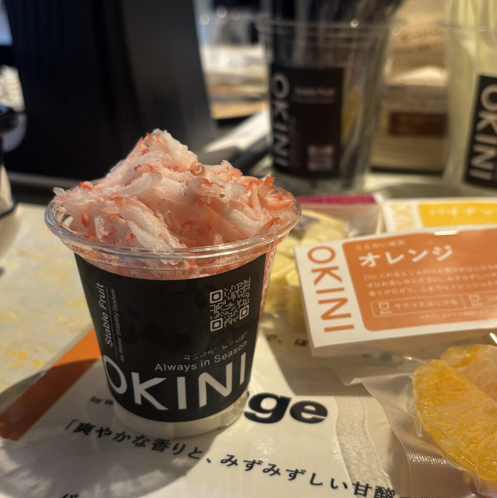 実際にパックされた冷凍フルーツシリーズ(パイナップル、オレンジ、蒸したさつまいも)と、Snow Berry🍓シリーズ(イチゴを削って)の販売も行います。
